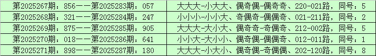 统计排列三已开出的奖号发现,在连续5期(第2025267期-第2025271)奖号为:856-321-875-018-898。