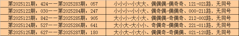 在排列三历史开奖中,第2025121期-第2025125期连续5期奖号为:424-030-842-527-627。