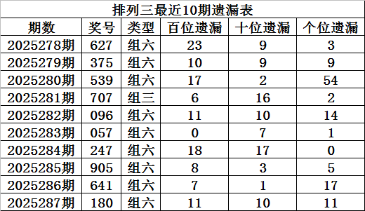 上期回顾:排列三第2025287期奖号:180,组六,直选遗漏总值为32期。