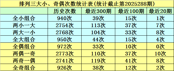 上期回顾:排列三第2025288期奖号:504。类型:组六,奇偶形态:奇偶偶,大小形态:大小小,和值:9,跨度:5。