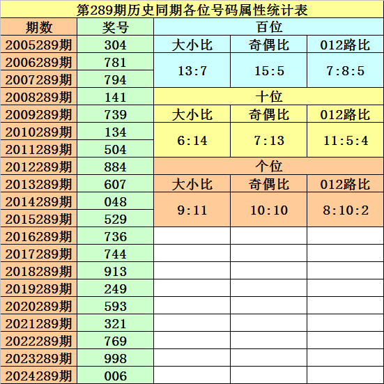 在第289期历史同期开奖中,号码0-9出现频次从高到低分别为:号码4→10次;号码9→9次;号码3、7→7次;号码0、1→6次;号码8→5次;号码6→4次;号码2、5→3次。一般来说,表现最热的号码:3479中至少出现1个奖号。同时奖号不会全部出现在表现最冷的号码中。
