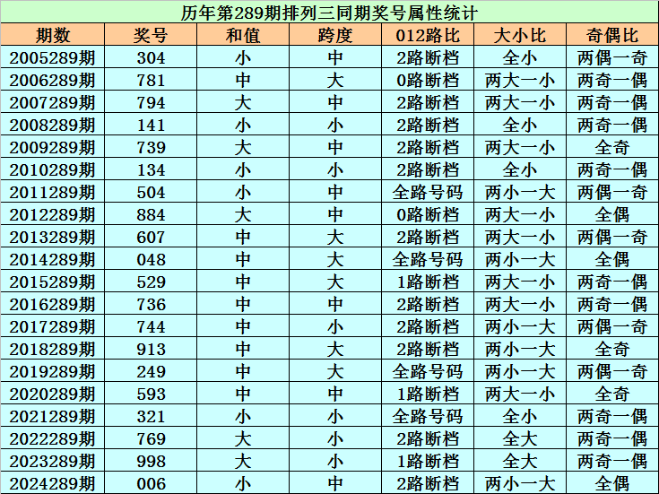 历史上第2025289期排列三已开出20期奖号了,历年同期奖号分别为:304、781、794、141、739、134、504、884、607、048、529、736、744、913、249、593、321、769、998、006,详细统计见下表: