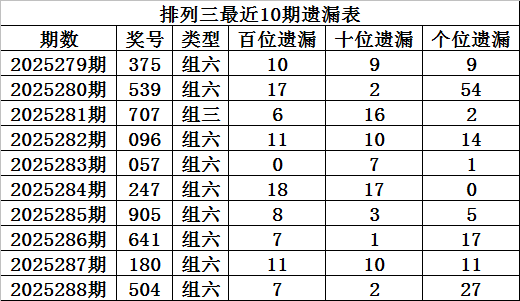 上期回顾:排列三第2025288期奖号:504,组六,直选遗漏总值为36期。