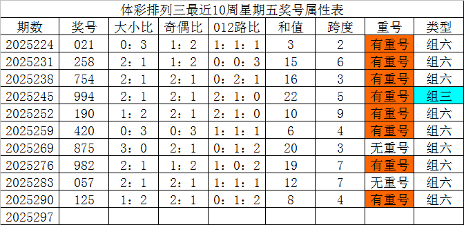 体彩排列三最近10周星期五奖号分别为:021、258、754、994、190、420、875、982、057、125,各奖号属性详见下表: