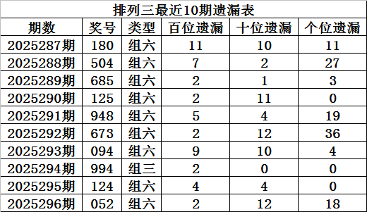 上期回顾:排列三第2025296期奖号:052,组六,直选遗漏总值为32期。