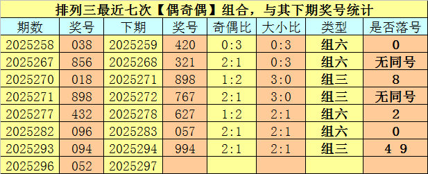 奇偶分析:排列三上期奖号为052,其奇偶类型为【偶奇偶】,最近七次出现奇偶类型偶奇偶的号码分别为:038、856、018、898、432、096、094,其下期奖号分别为:038、856、018、898、432、096、094。其中号码奇偶比为10:11,奇偶奖号开出比例基本相当,本期奇数热出的可能性较大,预计出现2个奇数号码。
