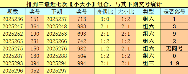 大小分析:排列三上期开出号码052,大小类型为【小大小】,最近七次开出大小类型小大小的奖号分别为:151、364、190、281、150、180、094,其下期分别开出号码:713、983、693、742、982、504、994。其中号码大小比为11:10,大小 号码出现次数基本相当,本期注意大号转热,看好出现2个大号。