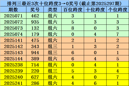 第2025280-第2025282期奖号:539、707、096,其下期奖号为:057,末位号码跨度为0;