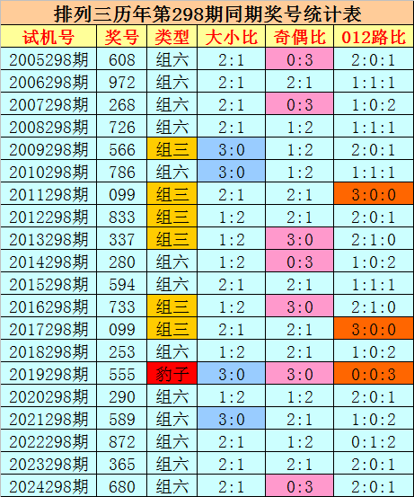 组选类型推荐:历史上排列三第298期同期奖号中,组六出现13期,组三出现6次,豹子出现1期,今年第298期预计奖号为组六号码。