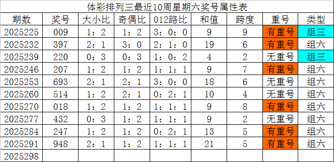体彩排列三最近10周星期六奖号分别为:009、397、220、207、693、514、018、432、247、948,各奖号属性详见下表: