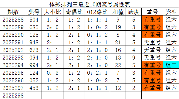 体彩排列三最近10期分别开出奖号:504、685、125、948、673、094、994、124、052、453,各奖号属性详见下表: