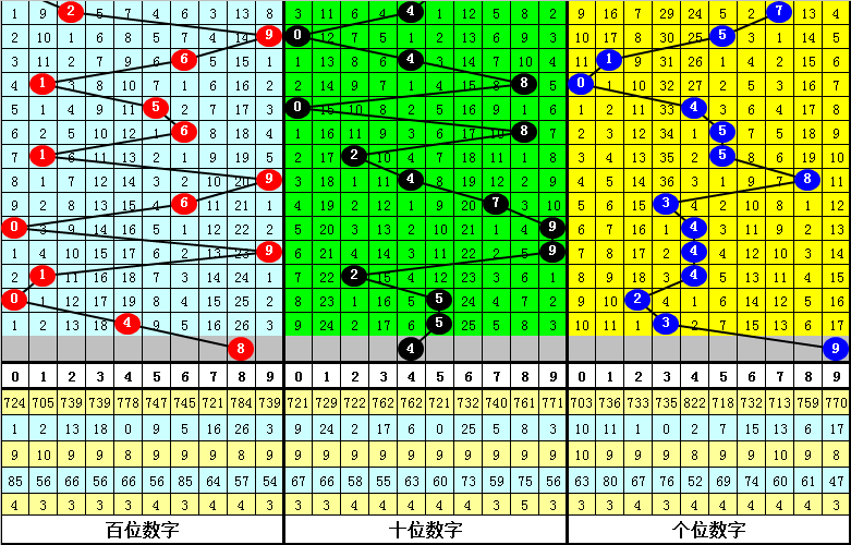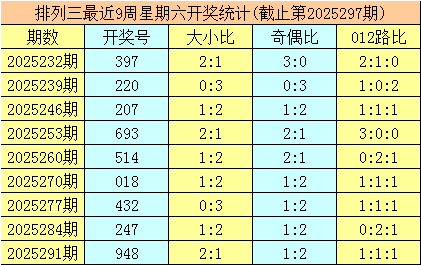 三、体彩排列三前9周星期六奖号分别开出:397-220-207-693-514-018-432-247-948,其中号码012路比为10:9:8,奇偶比为12:15,大小比为10:17;