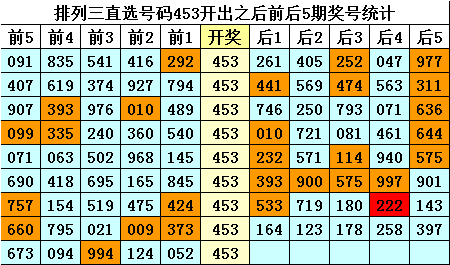 四、排列三直选号码453历史上开出9次,其前后五期奖号分别为: