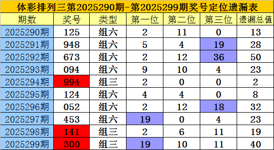 开奖回顾:排列三第2025299期奖号为:300,各位号码遗漏值分别为19、10、11,遗漏总值为40。