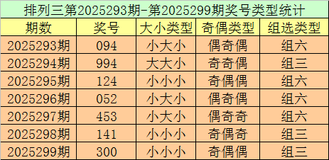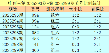 排列三第2025299期回顾:奖号300,奇偶比1:2,大小比0:3,和值3,类型:组三。
