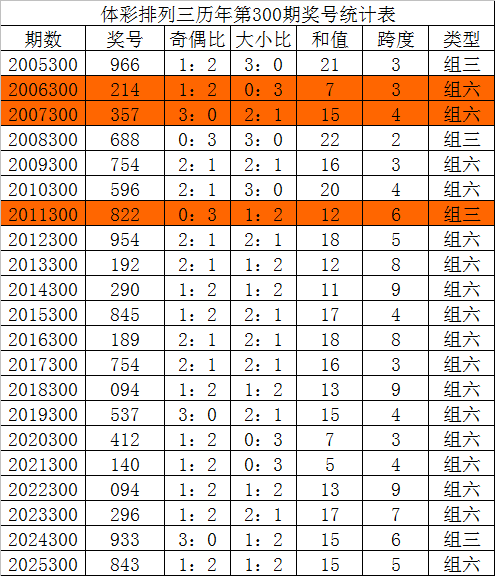 排列三第2025300期奖号为843,奇偶比为1:2,大小比为1:2,和值为15,跨度为5。