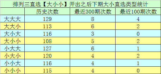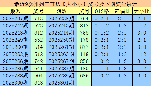 1.排列三第2025300期奖号开出843,大小直选分布为:大小小,在历史开奖中直选【大小小】分布已开出945期,在前9次直选【大小小】分布中,出现奖号为:713-523-812-532-514-512-742-641-504,都是组六。