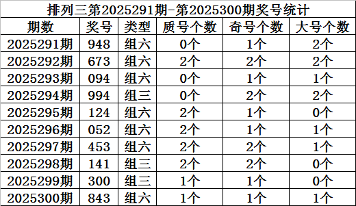 上期回顾:排列三第2025300期开奖:843,质合比为1:2,奇偶比为1:2,大小比为1:2。