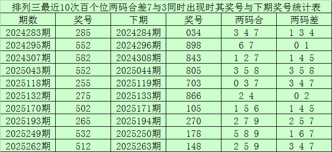 百个位合差分析:上期奖号百个位开出52组合,两码合为7,两码差为3,最近10次百个位两码合7与两码差3同时出现时,其奖号和下期奖号分别为: