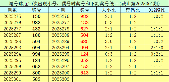 在尾号球前10次开出小 号、偶号类型之后,其下期分别开出奖号:982、432、627、504、685、994、124、052、453、843,其中号码大小比为2:8,012路比为2:4:4,奇偶比为4:6。