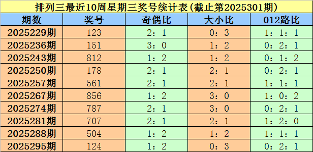 排列三第2025295期(上周星期三)奖号为124。其中奖号奇偶比为1:2,大小比为0:3,012路比为0:2:1。
