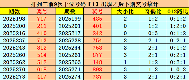 十位号码:十位上期开出偶数、大号、1路号码:1,历史上十位号码1共开出730期,上一次出现在第2025273期,上期奖号遗漏值为28期。