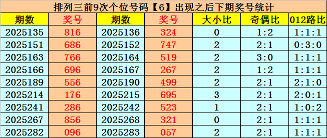 个位号码:上期奖号为大号、偶数、0路号码:6,历史上个位号码6共开出733期,前一次出现在第2025282期,上期遗漏19期再出。