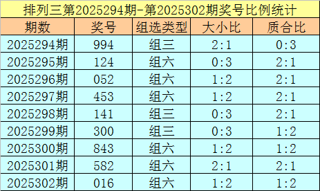 上期回顾:排列三第2025302奖号开出016,奖号质合比为1:2,大小比为1:2,跨度为6,类型为组六。