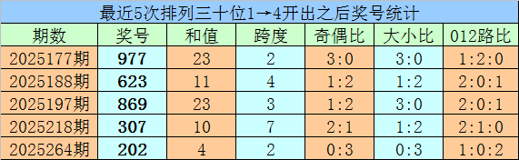 1、最近两期排列三十位号码开出号码分别为1和4,历史上十位号码连续两期同时出现号码1和4的奖号共开出81期。最近五次下期开出号码为:977、623、869、307、202;