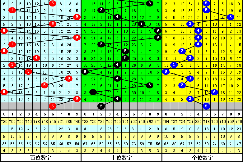 3、在以上0-9号码频次中,号码012路比为28:18:16,奇偶比为34:28,本期预计百位开出偶数号码,参考号码6。