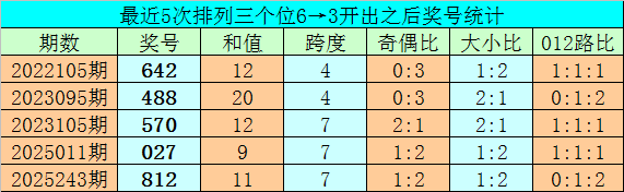 1、排列三前两期个位分别开出号码6和3,历史上个位号码连续两期分别出现6和3时,共有67次。在最近5次出现时,其下期分别出现号码:642、488、570、027、812;