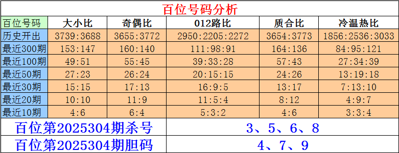 近期百位大号表现较冷,上期大号出现之后,近期适当关注大号转热,预计连续开出;该位奇号走势相对较冷,上期回补之后,本期预计连续开出奇号。百位本期杀号:3568,胆码关注:479。