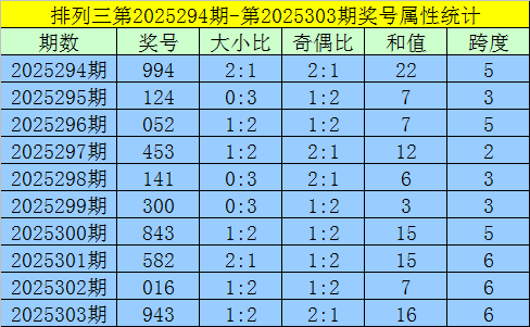 上期回顾:排列三第2025303期出现奖号943。开出组六,奇偶比2:1,012路比2:1:0,大小比1:2,和值16,跨度6。