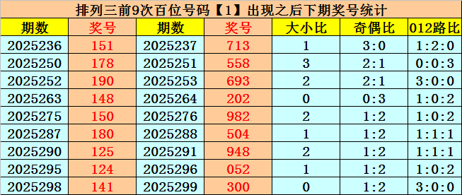 百位号码:百位上期奖号为1路、偶数、大号:1,历史上百位号码1共开出707期,前一次开出期数在第2025298期,上期奖号隔7期再次开出。