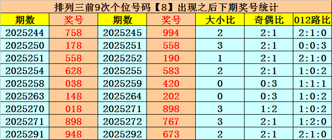 个位号码:上期奖号为大号、偶数、2路号码:8,历史上个位号码8共开出760期,前一次出现在第2025291期,上期遗漏14期再出。