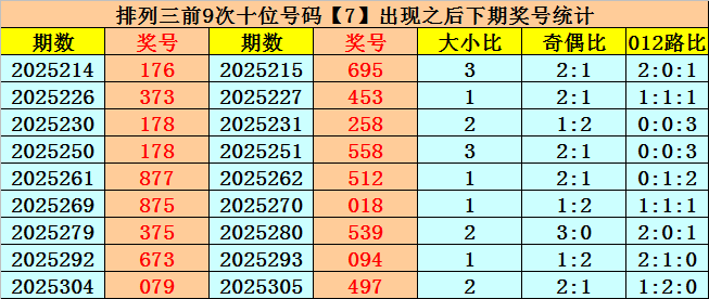 十位号码:十位上期开出偶数、大号、1路号码:7,历史上十位号码7共开出742期,上一次出现在第2025304期,上期奖号遗漏值为1期。