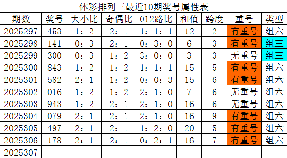 体彩排列三最近10期分别开出奖号:453、141、300、843、582、016、943、079、497、178,各奖号属性详见下表: