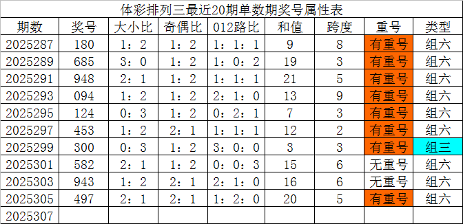 体彩排列三最近20期单数期奖号分别为:180、685、948、094、124、453、300、582、943、497,各期奖号详细属性下表: