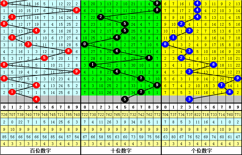其中,号码0-9开出次数分别为:号码0开出4次、1开出4次、2开出1次、3开出4次、4开出5次、5开出2次、6开出1次、7开出3次、8开出3次、9开出3次。
