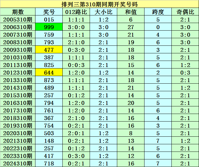 本期为排列三第2025310期开奖,开奖日期为:2025年11月20日,历史上排列三第310期已开出了20次奖号,历年同期开出号码分别为:015-999-759-793-477-387-825-644-873-489-257-794-761-367-754-503-148-257-417-718。