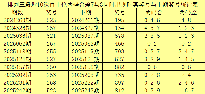 百十位合差分析:上期奖号百十位开出52组合,两码合为7,两码差为3,最近10次百十位两码合7与两码差3同时出现时,其奖号和下期奖号分别为: