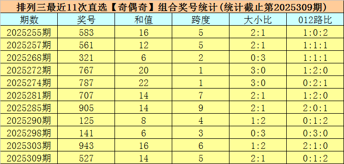 开奖回顾:排列三第2025309期开出奖号:527,类型为组六,和值为14,奇偶比为2:1,大小比为2:1,跨度为5。