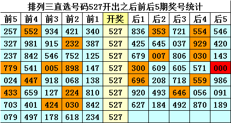 四、排列三直选号码527历史上开出8次,其前后五期奖号分别为: