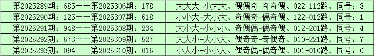 则,排列三第2025294期奖号:994,与排列三第2025311期奖号可能有相同的号码。且排列三第2025311期奖号大小比、奇偶比和012路比可以参考第2025294期奖号形态:大大小、奇奇偶和001路。
