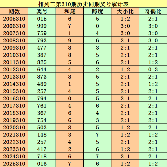奇偶比参考:在第311期排列三历史同期中,奖号奇偶比1:2→8期,2:1→7期,0:3→3期,3:0→2期,其中奇偶号码总比例开出28:32,偶数开出较多,本期预计奇数热出,奇偶比关注2:1。