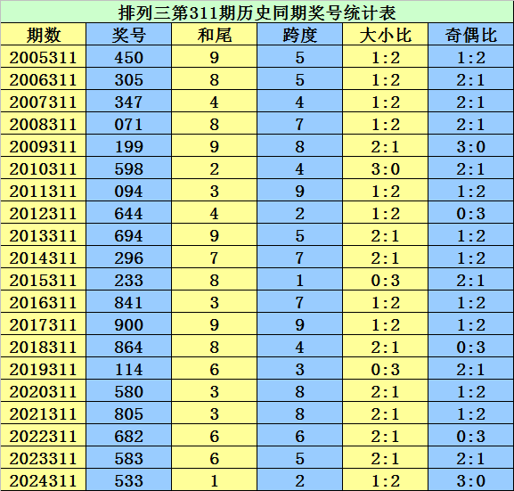 历年第311期排列三同期奖号开出:450、305、347、071、199、598、094、644、694、296、233、841、900、864、114、580、805、682、583、533。