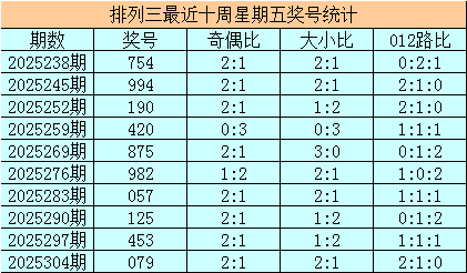 排列三十周星期五分别开出奖号:079、453、125、057、982、875、420、190、994、754,其中号码奇偶比为17:13,奇偶号码出现比例相当;号码大小比为16:14,大小 号码基本持平;号码012路比为10:10:10,基本持平。