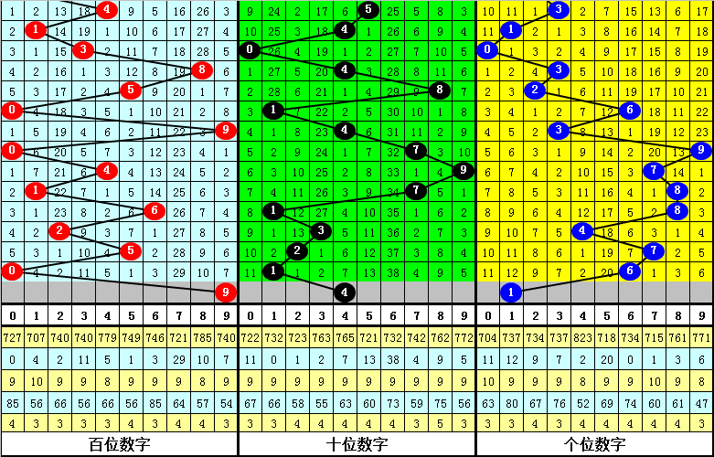 百位分析:该位最近10期出现范围在0-9之间,波动了10个点位,波动范围较大,上期开出号码0,下降了5个点位,本期预计该位号码上升。另外该位最近10期大小比为4:6,大号走冷,本期看好大号回补,参考号码9。
