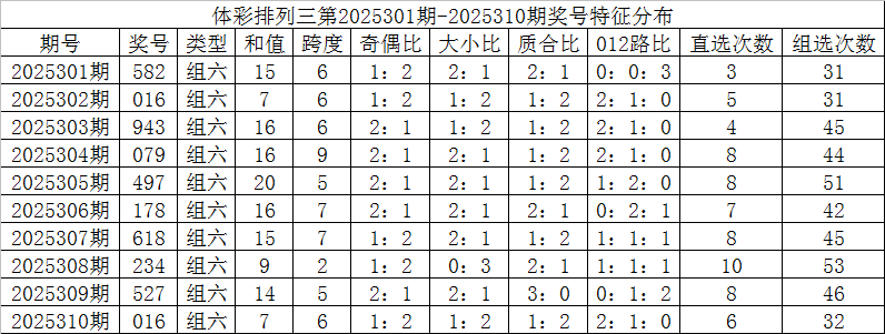 开奖公告:体彩排列三第2025310期开出奖号:016。组六,无重号,奇偶比1:2,大小比1:2,012比2:1:0,和值7,跨度6。