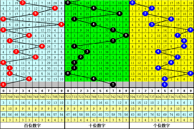 首位跨度分析:首位号码最近3期奖号为1-1-4,连续两期跨度为0、3,历史上首位号码连续两期分别开出跨度0、3的现象共出现85次,其前两次开出奖号分别为:
